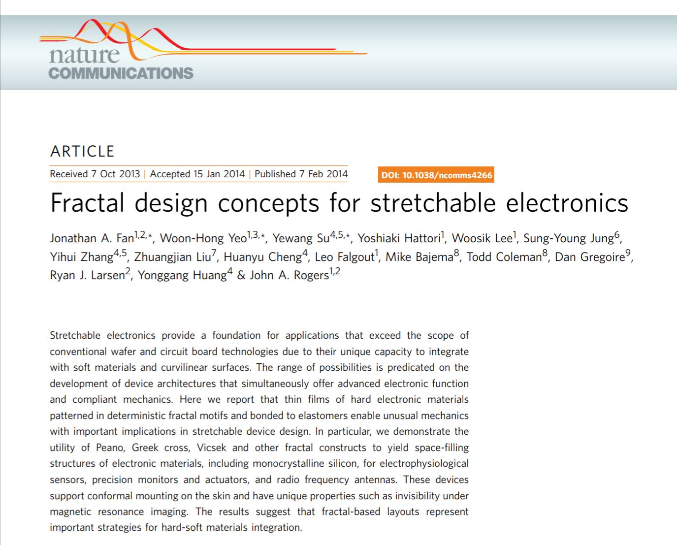 WALTHAM, Mass.--(BUSINESS WIRE)--A newly published study by an international group of researchers has shown that fractals, complex geometric shapes that repeat of many size scales, are making possible a new era in design and utility for conformal and worn electronics. Writing in the journal Nature, the research group, headed by Jonathan Fan, showed that fractals offer unique benefits functioning as circuits and antennas, especially in stretchable applications, such as on-body. This makes them a key innovation for future wireless applications with people in mind.